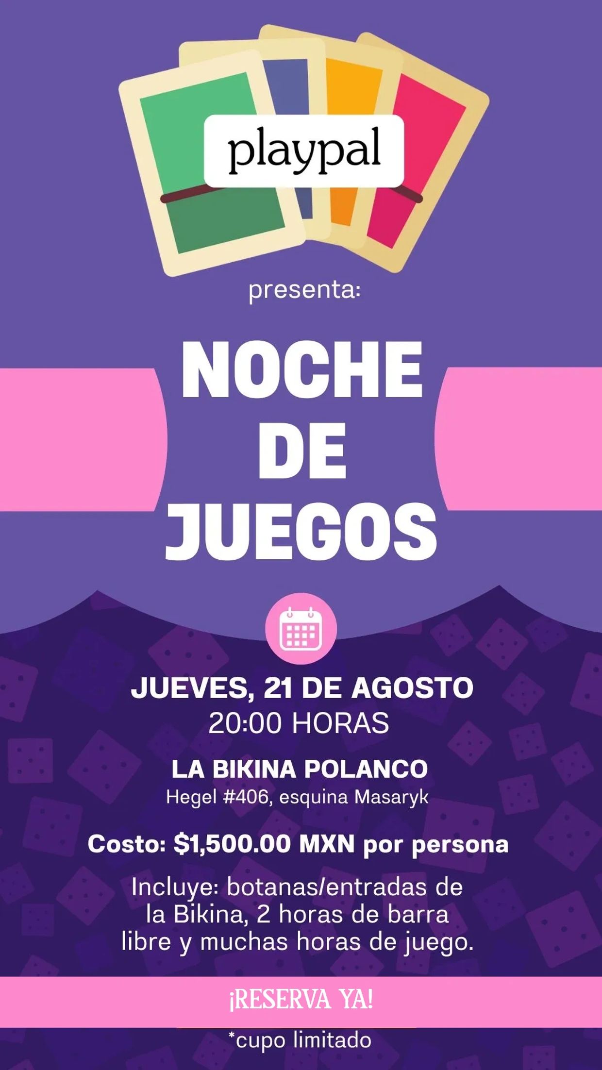 Queremos expandir las modalidades en las que puedes disfrutar de una noche de juegos con PlayPal. Por eso, este jueves 21 de agosto de 2025, te invitamos a ser parte de la primera noche de juegos que, además de varias horas de diversión, incluirá también comida y barra libre por tiempo limitado.